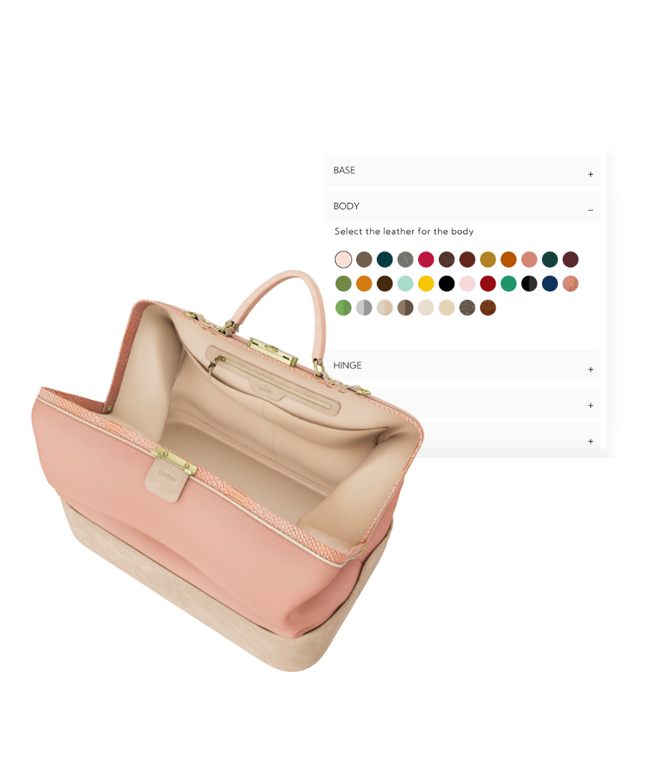 With our 3D Design Tool, you can personalize six key parts of your Office bag: the base, body, hinge, details, handle, and lining. Every choice is yours, allowing you to create a bag that perfectly reflects your style and personality.